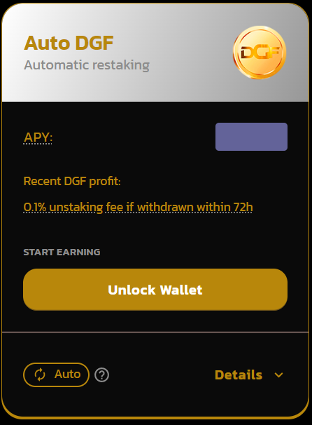 Stake your DGF and forget about it! The DGF you stake in this Pools will be automatically compounded (reinvested) for you, minus a small fee.